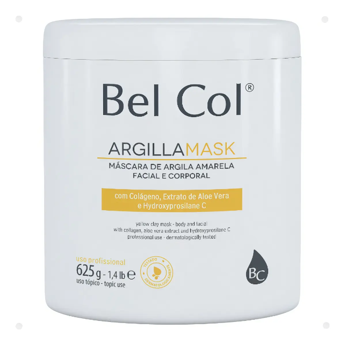 A ArgillaMask Amarela Bel Col é uma máscara de argila enriquecida com ingredientes hidratantes e ante flacidez cutânea. Indicada para auxílio de procedimentos corporais e faciais em cabine. Promove leve esfoliação, tem efeito revitalizante e de firmeza na pele, podendo ser combinada em diversos protocolos de tratamentos cosméticos para a pele.