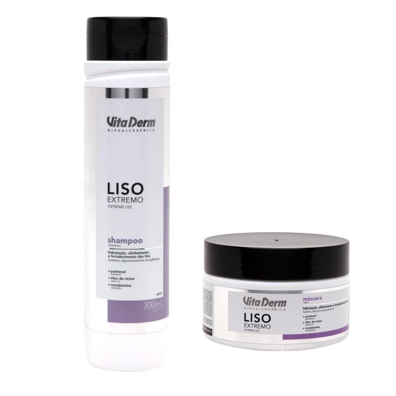 O Shampoo Liso Extremo Vita Derm 300ml higieniza os fios enquanto protege a fibra capilar prolongando o efeito liso, eliminando o frizz, com ativos que hidratam, fortalecem e estimulam o crescimento dos fios. Produto vegano e cruelty free. Sem parabenos, sem petrolatos, sem óleos minerais, sem parafina, sem adição de sal.