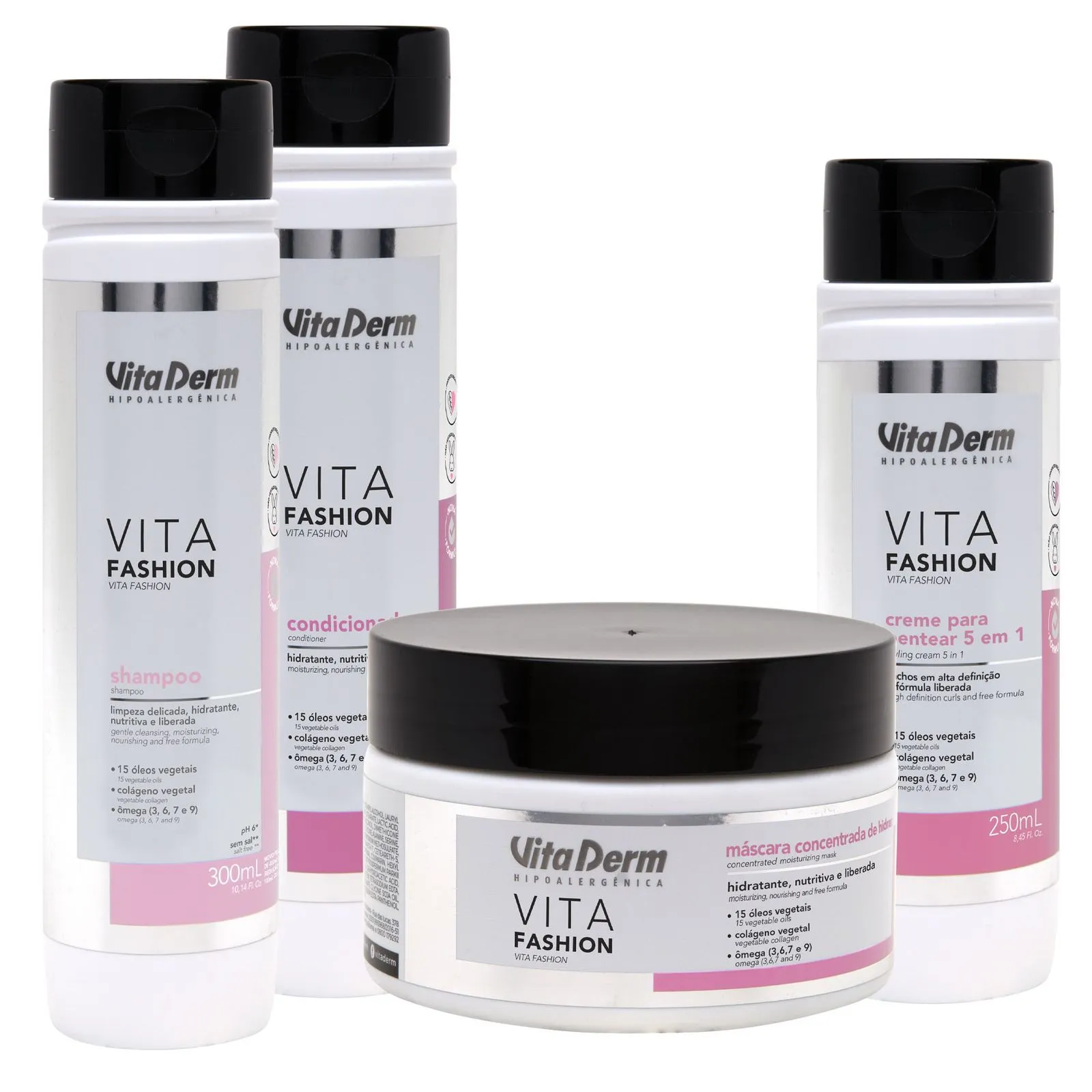 O Kit Vita Fashion promove limpeza delicada, desembarace instantâneo, hidratação, modelagem, definição, reparação e nutrição.